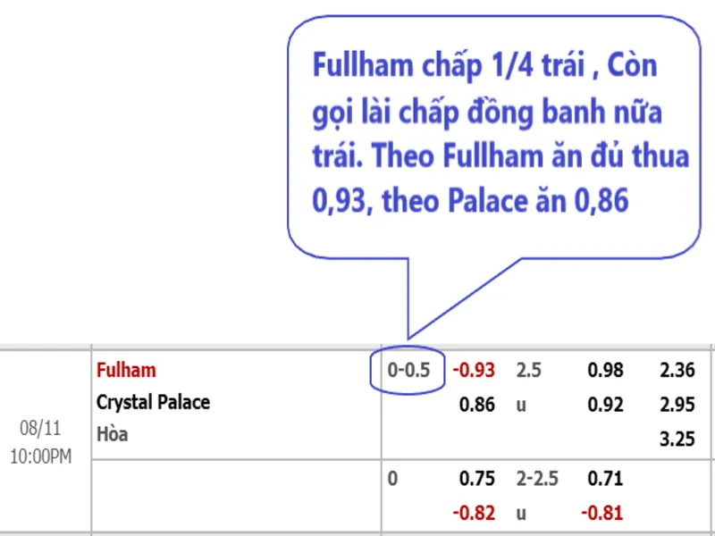 - + 0.25 hoặc + 0-0.5: Hiển thị tỷ lệ chấp cho đội cửa dưới